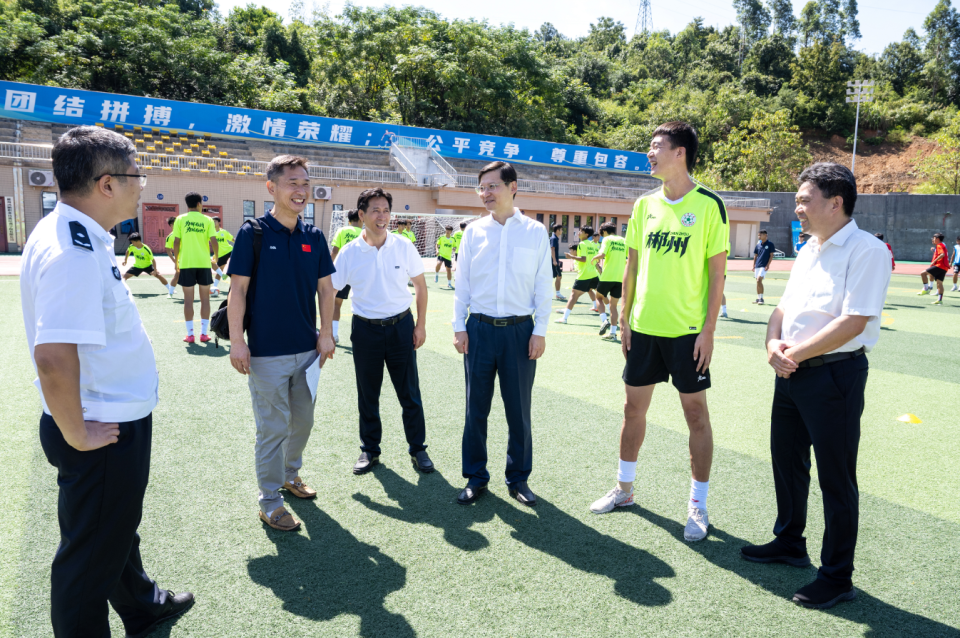 在郴州技师学院足球场,阚保勇看望慰问正在训练的郴州队教练、球员,了解日常训练及比赛情况,鼓励大家赛出精气神、赛出高水平。